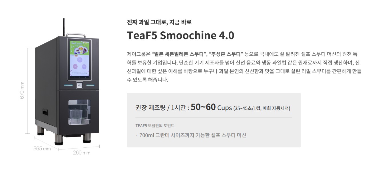TEAF5(티파이브)는 셀프형 즉석 스무디 붐의 원조, 일본 편의점에서 본 바로 그 아이템의 원천 기술 특허를 보유한 기업으로, 스무디 머신부터 과일 원재료까지 직접 제작하는 글로벌 기업입니다.